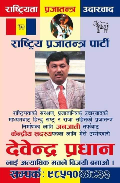 राष्ट्रिय प्रजातन्त्र पार्टी (राप्रपा) को केन्द्रीय सदस्यमा देवेन्द्र प्रधानले उम्मेदवारी दिने भएका छन् । उनी अहिले पनि पार्टीको केन्द्रीय सदस्य हुन् ।