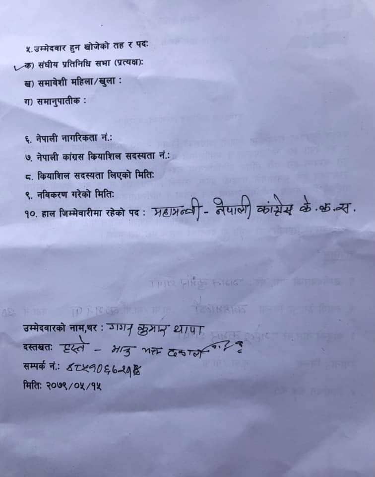 कास्की कांग्रेसका सचिव भानुभक्त ढकालले महामन्त्री थापालाई कास्की १ मा उम्मेदवार सिफारिस गर्न आवेदन दिएका हुन्।