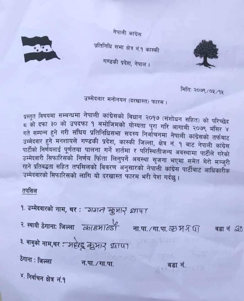 नेपाली कांग्रेसका महामन्त्री गगन थापालाई कास्की क्षेत्र नम्बर १ बाट प्रतिनिधि सभा सदस्य उम्मेदवार बनाउन आवेदन परेको छ।